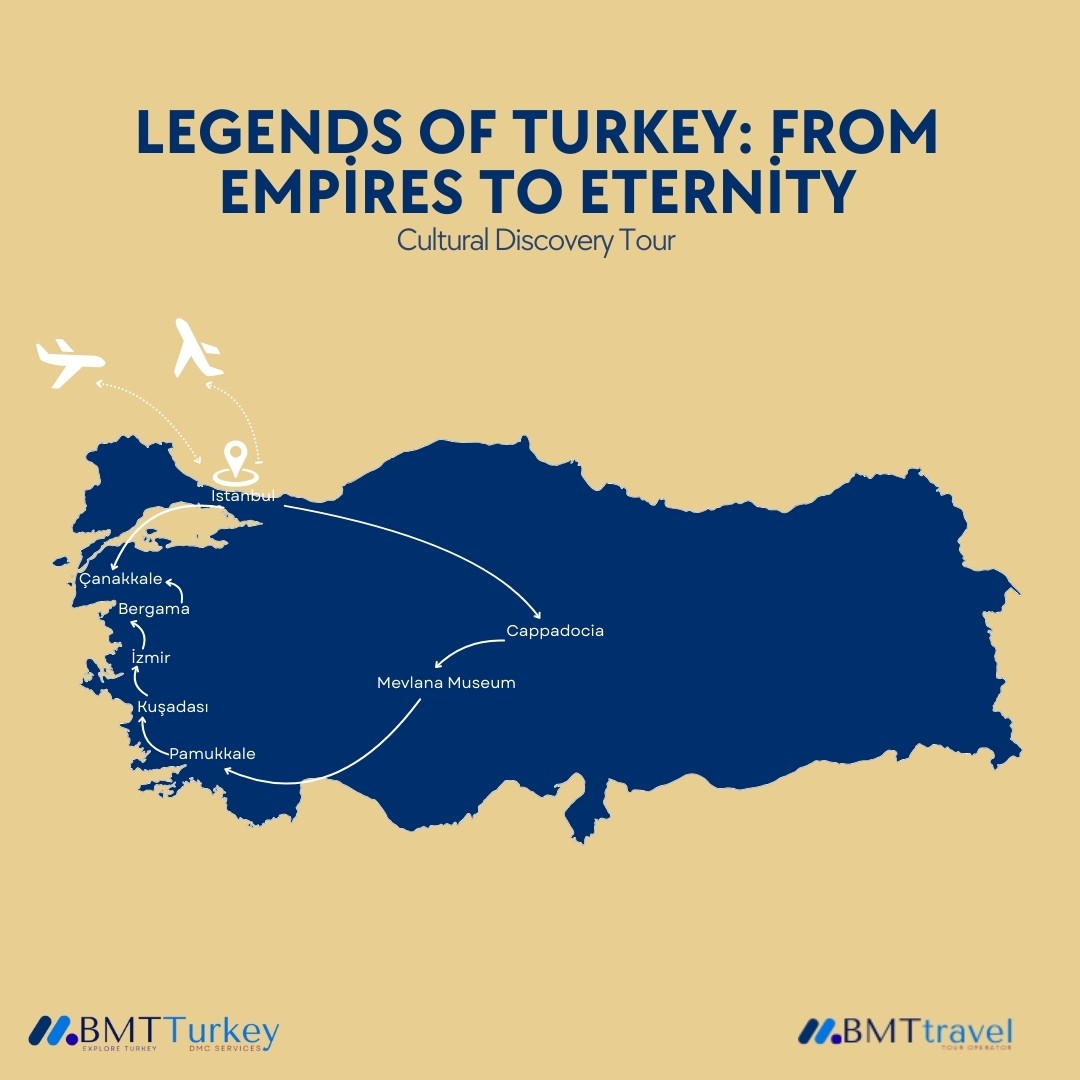 Legends of Turkey – From Empires to Eternity is an 11-day cultural odyssey through the soul of Anatolia. Designed by BMT Travel for curious minds and history lovers, this immersive journey unveils Turkey’s most iconic landmarks, natural wonders, and spiritual heritage.