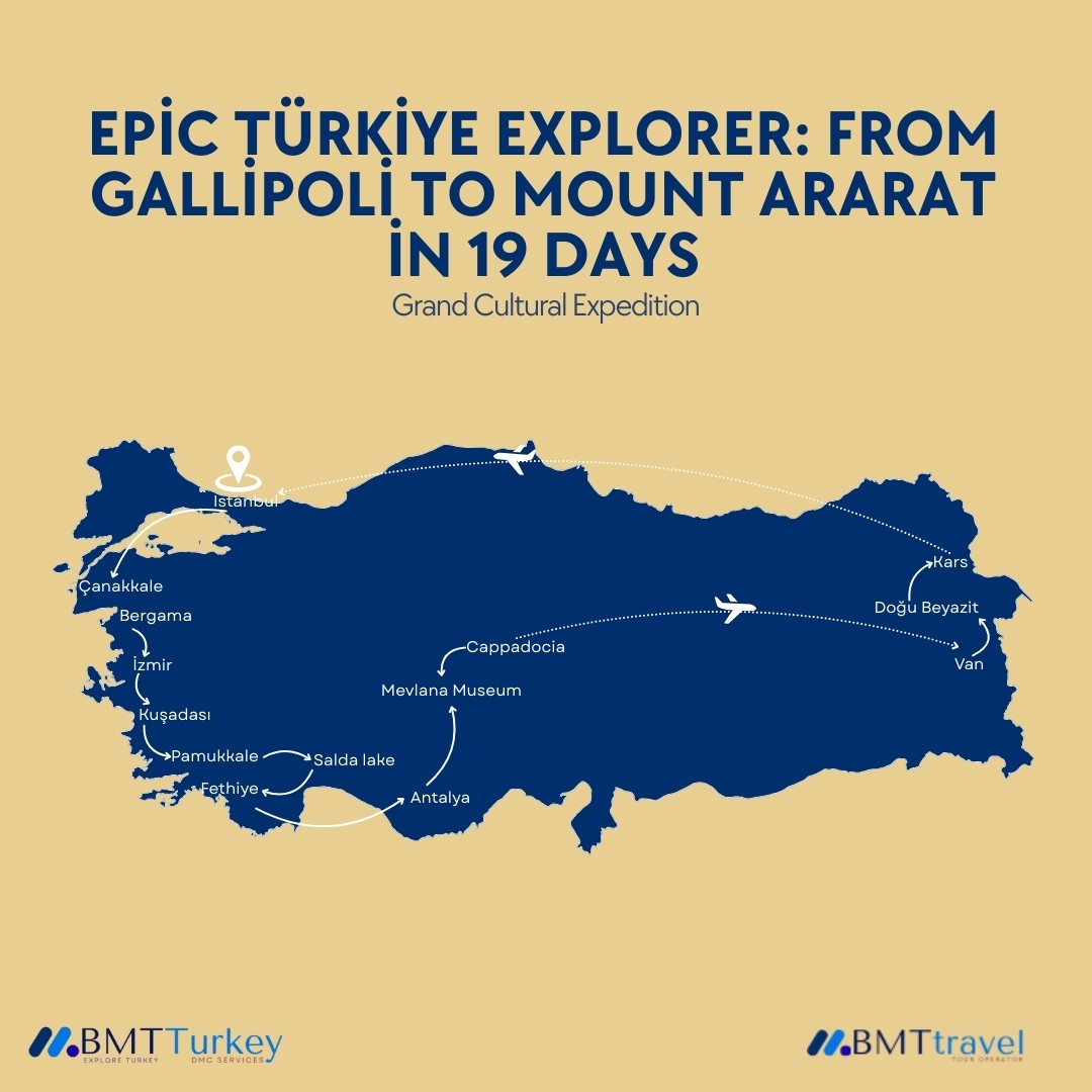 This 19-day journey is Türkiye in full panorama. From the WWI battlefields of Gallipoli to the ancient cities of Troy and Ephesus, the white terraces of Pamukkale to the turquoise coast of Fethiye, the spiritual heart of Konya to the lunar landscapes of Cappadocia—and onward to the mystical east: Van, Akdamar Island, Mount Ararat, and the haunting ruins of Ani. This is Türkiye’s soul, uncovered.