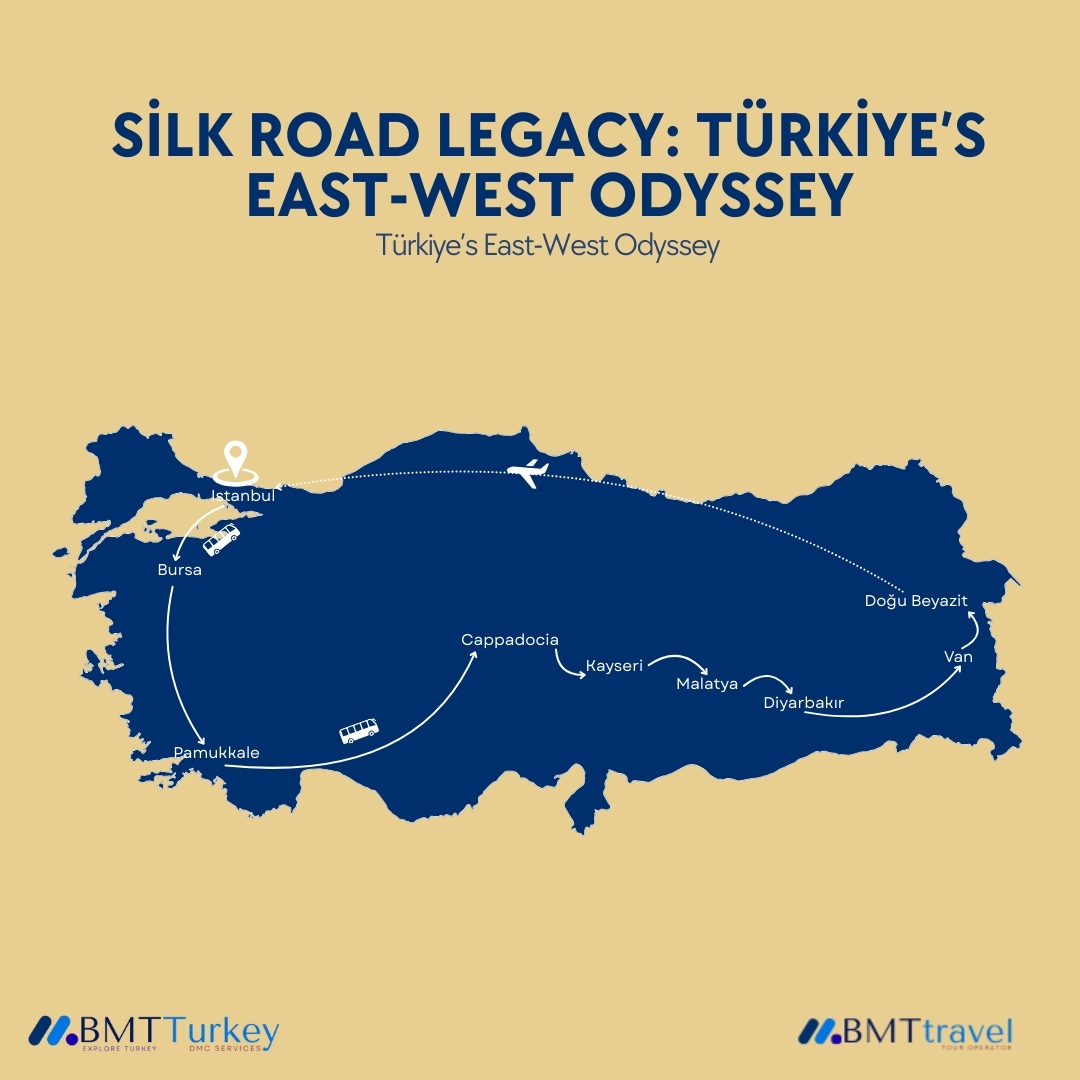 This 12-day journey follows Turkey's Silk Road, from Istanbul to Ağrı. Along the way, travelers will discover Ottoman bazaars, Phrygian ruins, caravanserais, Byzantine churches, and oriental palaces. From the travertine terraces of Pamukkale to the fairy chimneys of Cappadocia, and through the fortress cities of Diyarbakır and Van, this tour is a living mosaic of civilizations.